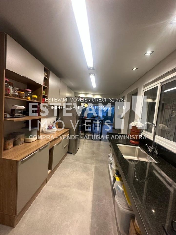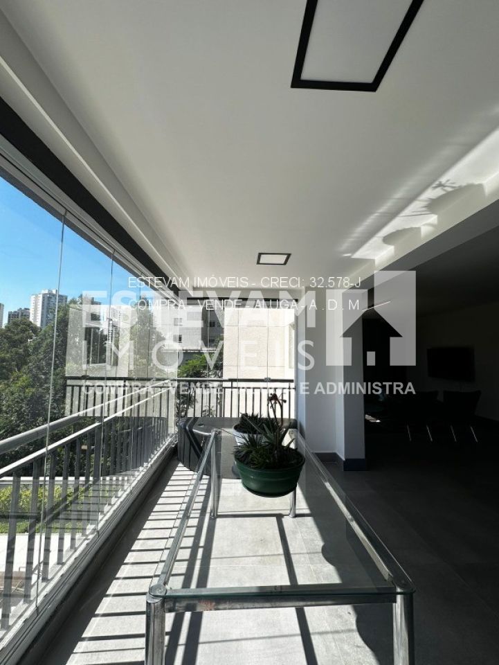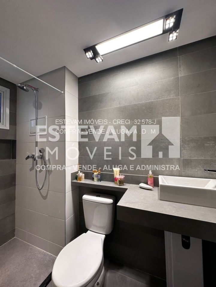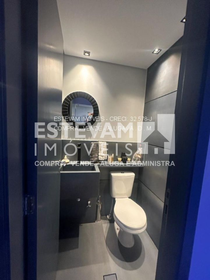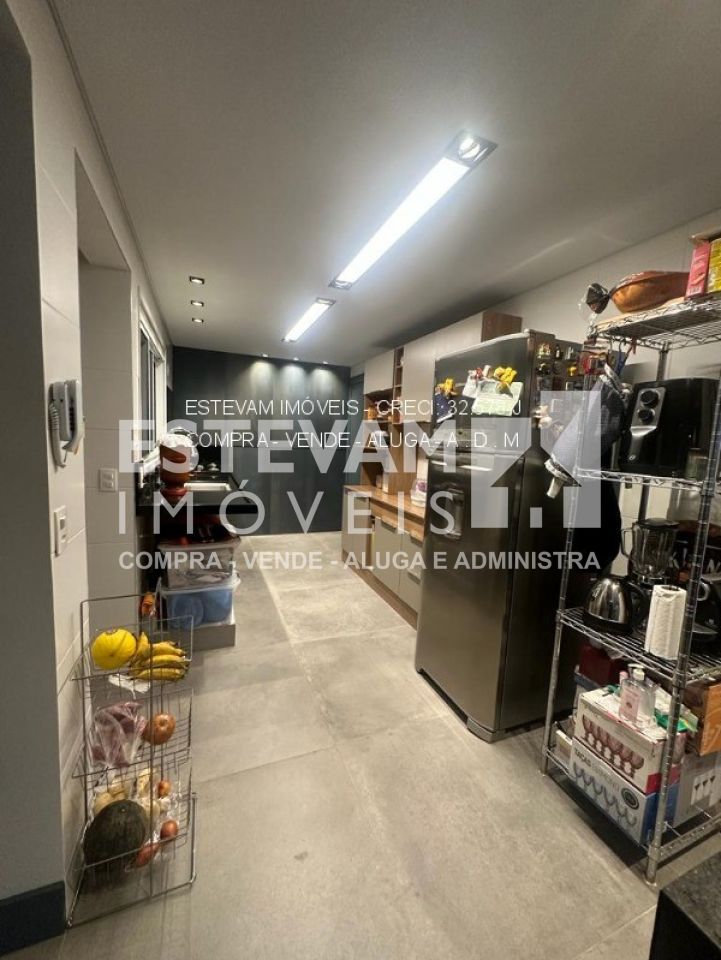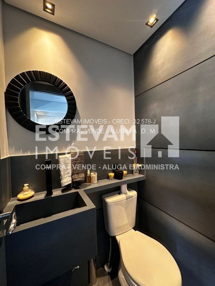 O apartamento também conta com banheiro de empregada, lavabo social, lavanderia grande com varanda técnica e toda a estrutura de ar condicionado pronta. O condomínio oferece depósito e duas vagas de garagem.